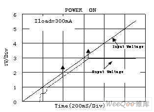 在测试压差(Dropout)时不同的厂家有不同的标准。德州仪器(TI)电压差定义为输出电压较其标称值跌落2%时的输入、输出电压的差值.其它的如,美信(Maxim),圣邦微电子(SGMC)电压差定义为输出电压较其标称值小于100mV时的输入、输出电压的差值.如图为圣邦微电子的SGM2007负载为300mA时输入电压和输出电压的曲线。