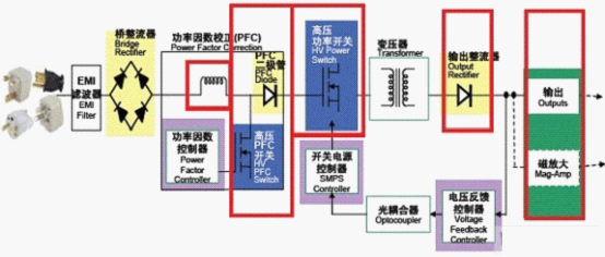 在一个电源设计中,能效规范对电路段的挑战主要体现在PFC能效、主转换器能效和次级能效几个方面。要提高这几个方面的能效,就必须改善如图1所示电路红色框中的元件性能。以下将介绍改善电路段能效的几种方法。