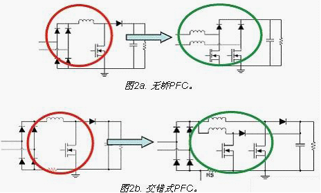 改善PFC能效的目标是为了实现功率因数校正短的效率达到96%以上。采用无桥PFC(图2a)可以减少桥损耗,采用交错式PFC(图2b)可以满足较高功率应用的要求,以提升PFC能效。此外,还可以利用IC技术减少开关损耗,并利用更优化的拓扑结构来减少EMI滤波器损耗。