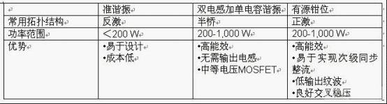 要提高主转换器能效可以采用以下几种方法。一是通过降低导通阻抗(开关损耗较高)和/或减小初级峰值电流和均方根电流来降低初级导通损耗;二是考虑采用软开关技术降低开关损耗;三是通过减少整流器压降(使用低正向压降二极管或FET整流器)来降低次级损耗;四是采用更好的磁芯材料来降低磁芯损耗。表1列出了主要软开关的拓扑结构,可供设计时参考。