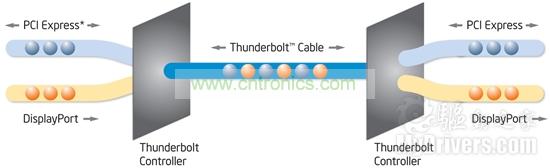 Thunderbolt接口由一颗Intel控制芯片驱动,通过PCI-E x4、DisplayPort总线与系统芯片组相连,也可以直接连接Intel处理器内集成的图形核心进行DisplayPort输出。