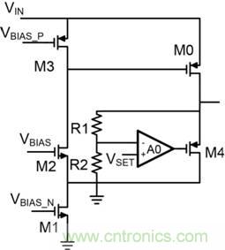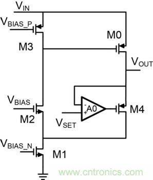图3:M4位于放大器反馈环路中、无输出电容器的LDO。