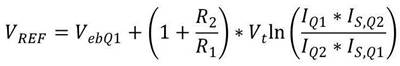 其中VEB是Q1的基射极间电压,VT是热电压,IQ1和IQ2是通过晶体管Q1和Q2的电流,而 IS,Q1和IS,Q2则分别是Q1和Q2的饱和电流。
