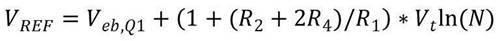 通过添加双极性晶体管的负温度系数基射极间电压,可获得带隙电压的低温系数,从而可通过在不同电流密度下偏置的两个基射极间电压之差获得正温度系数电压。为电阻器R2和R3选择相等的值,参考电压就可表示为公式5: