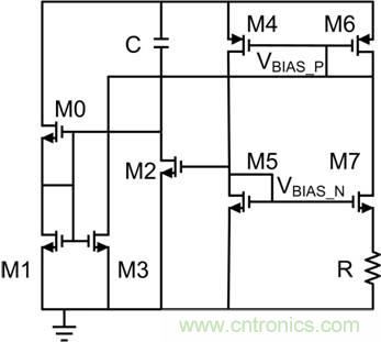 偏置发生器通常不需要特别启动电路,这可减少静态电流和占用面积。如果电流足够小,电阻R 就可以忽略。由M5/M7和M4/M6构成的两个电流镜可互连成一个闭环。