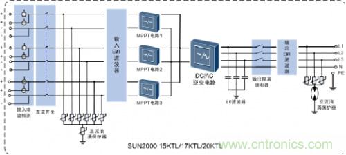 光伏逆变器由升压回路和逆变桥式回路构成,升压回路主要用于将直流电压升压至逆变器输出所需直流电压,逆变桥式回路主要用于将升压后的直流电压转换为固定频率的交流电压。因此,经升压回路和逆变桥式回路完成将直流电转换为交流点的功能。