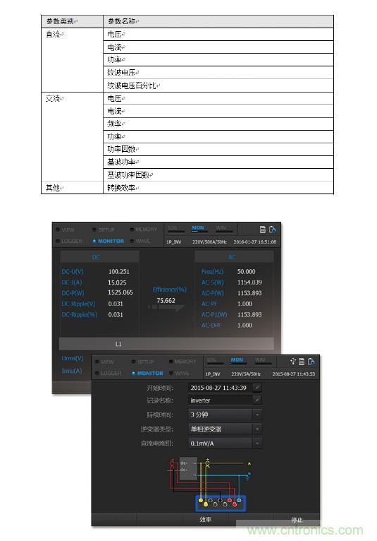 E6500电能质量和能效分析仪可以快速测量逆变器转换效率以及功率。目前支持单向逆变器与三相逆变器测量,主要测试功能如下: