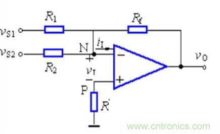 如下图1-2,是运放实现的加法器,用虚短和虚断的方法来分析此电路。