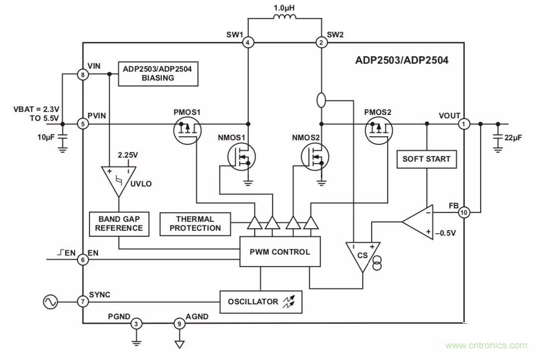 这样的器件譬如ADI公司的ADP2503和ADP2504降压-升压转换器,它们内置四个开关、两个电容和一个电感。