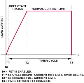 利用软启动,浪涌电流在软启电容设定的期间可以从零线性增加到满量程。通过逐步提高基准电流,能避免浪涌电流突然达到30 A的限制。需要注意的是,在软启过程中,电流处于调整过程中,因此,定时器从软启动开始之际就进入工作状态,如图5所示。