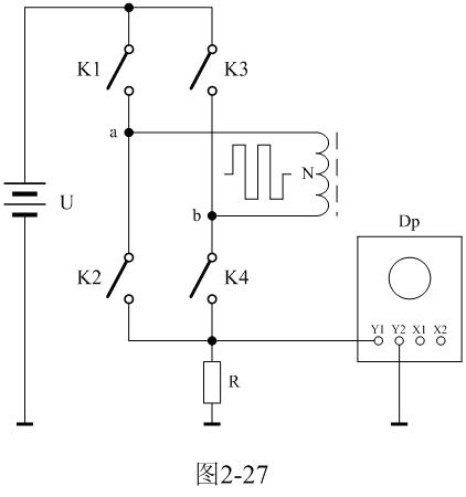 图2-27中,U是电源电压,N为变压器初级线圈,控制开关K1、K2、K3、K4组成桥式开关控制电路,K1和K4为一组,K2和K3为一组,两组开关轮流接通与断开,把电源电压正反向加于变压器初级线圈两端;R为取样电阻,通过测量R两端的电压,就可以知道流过变压器初级线圈的电流;取样电压被送到示波器Dp进行显示。