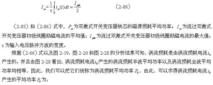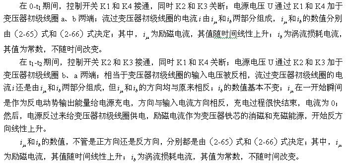 根据前面分析,磁滞损耗主要由励磁电流 产生的,但双激式开关变压器初级线圈中的励磁电流与单激式开关变压器初级线圈中的励磁电流产生的作用并不完全相同。单激式开关变压器初级线圈中的励磁电流产生磁场对变压器贴芯进行充磁和退磁外,其存储的能量只能用来作为反激式输出给负载,因为变压器初级线圈输入的电压是单极性脉冲,变压器初级线圈无法换相。
