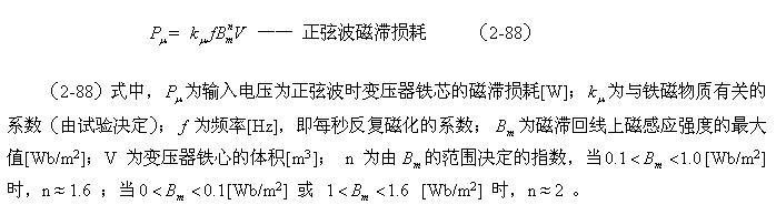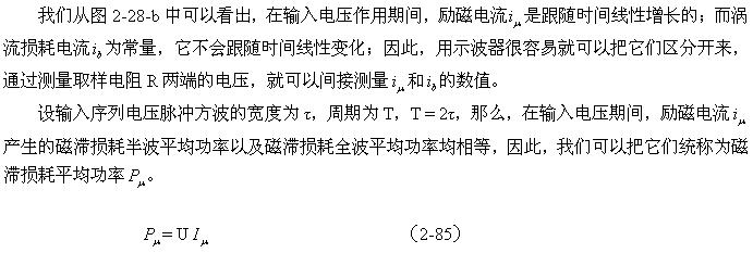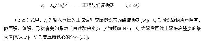这里顺便指出,利用(2-88)和(2-89)式来分别测试变压器铁心的磁滞损耗和涡流损耗是非常困难的;一个是它们的系数很难决定,另一个是两者很难分别进行测量,或从测量结果中进行分离。对比两式的参数就可以知道,它们之间最大的区别是频率对损耗的影响程度;一个是与频率成正比,另一个是与频率的平方成正比。