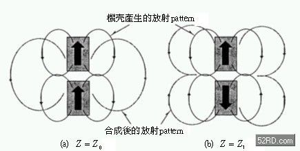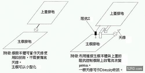 此处采取在连接移动通讯系统折叠机壳上增设阻抗(Impedance)Z,如此就能够利用一种天线获得多样的放射pattern,这种设计最大优点是可以大幅缩小天线的设置场所与天线结构物的尺寸。