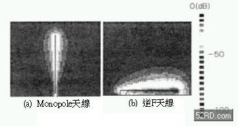由上式可知如果缩任意小天线大小的话,Pr会比Pd小导致放射效率大幅降低,这种现象尤其是天线附近的电磁界更加明显。图2是提供相同电力给两种天线时,天线附近的实际电界分布状态,图中的单极(Monopole)天线高度为λ/4(此处λ表示天线频率的对应波长)属于中等大小天线,此时单极天线最大强度大约是-20dB。