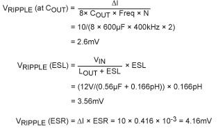 选择输出电容的关键参数是实际电容值、ESR、ESL和额定电压。这些参数会影响系统的整体稳定性、输出电压纹波以及瞬态响应,输出纹波电压包含三部分,即输出电容储存电荷的变化,电流流入、流出电容时在ESR和ESL上产生的压降。下面给出了选择电容使用的公式。