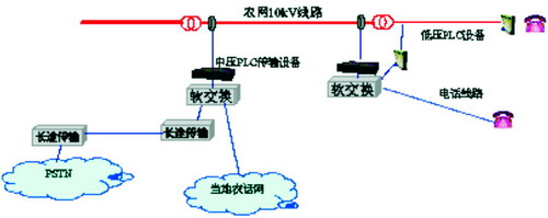 在发展中国家,这一矛盾尤其突出。就国内的情况而言,我国幅员辽阔,有相当数量的农村地区处于偏远、人烟稀少的地带,这些区域的通信发展相对滞后。据统计,我国行政村固定电话覆盖率为94%~97%,数据通信的覆盖率则更低。由于自然和经济条件的制约,若采用现有的通信方式,改善这些地区的信息服务将面临越来越多的困难。而行政村的通电率已接近100%,且电网覆盖是区域发展的基本条件,因此,利用电力传输网络实现宽带网络接入,是适合国情、可行并且经济的方案,图1为农村中压PLC接入网系统的结构示意图。
