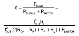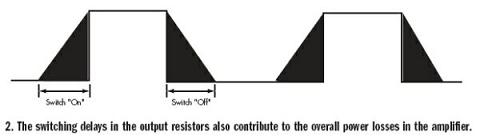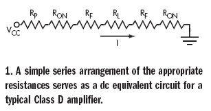 有两个晶体管“开”的典型的D类放大器的直流等效电路只是一连串的串联电阻:RON,每个晶体管的输出传导损耗;RP,金属互连线,引线结构和PC板走线的附加电阻;PL,负载电阻(图1)。另一个产生功耗的是输出电阻中的开关延迟(图2)。整个系统的效率使可以估算如下: