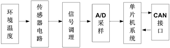 该温度检测节点由传感器电路、信号调理电路、单片机应用系统、CAN总线接口等构成。电路基本工作原理是:传感器电路将感应到的温度信号以电压的形式输出到信号调理电路,信号经过调理后输入到A/D采样电路,由ADC将数字量值送给单片机系统。单片机系统将监控实时温度,当温度超过警戒值和危险值时,单片机将主动发送警告信息到上位机,提醒操作人员检查。模块逻辑结构如图1所示。