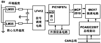 本节点的核心MCU是PIC16F87x,是Microchip公司推出的低功耗8位单片机。PIC16F87x拥有精简指令集,执行速度为200ns。CAN控制器采用Microchip公司的MCP2510,总线驱动器采用PCA82C250,总线隔离电路采用光耦6N317,信号调理电路采用LF412。温度监测??榈挠布峁谷缤?所示。
