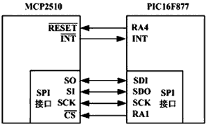 其中,SCK为SPI总线时钟,PIC16F87x模块的SPI接口接MCP2510的SI、SO、SCK,RA4与RA1分别控制MCP2510的芯片复位和片选。INT接受MCP2510的中断请求。