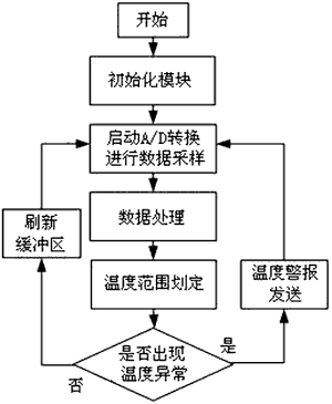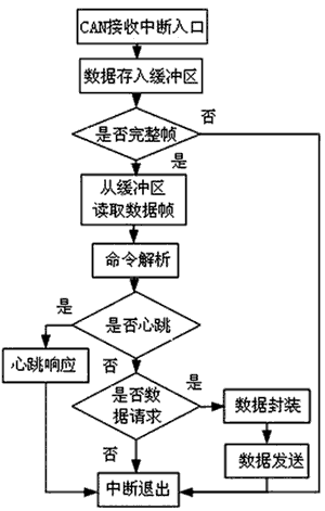 当CPU检测到温度出现异常,会根据温度异常范围向上位机发出温度异常警报,这是该节点CPU唯一主动向上位机发出的数据帧。该节点的温度相关数据存放在缓冲区,在没有收到上位机数据请求的时候,该缓冲区的数据会不断的被新的数据刷新,以保证该节点数据的实时性,中断流程如图5所示。