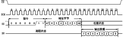 在读操作开始时,CS引脚将被置为低电平。随后读指令和8位地址码(A7~A0)将被依次送入MCP2510。在接收到读指令和地址码之后,MCP2510指定地址寄存器中的数据将被移出通过SO引脚进行发送。每一数据字节移出后,器件内部的地址指针将自动加一以指向下一地址。因此可以对下一个连续地址寄存器进行读操作。通过该方法可以顺序读取任意一个连续地址寄存器中的数据。通过拉高CS引脚电平可以结束读操作,如图6所示。