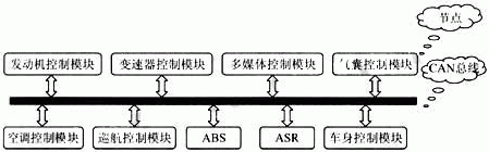 现代汽车典刑的控制单元有发动机控制???、变速器控制??椤⒍嗝教蹇刂颇??、气囊控制???、空调控制???、巡航控制模块、车身控制模块(包括照明指示和车窗、刮雨器等)、防抱死制动系统(ABS)防滑控制系统(ASR)等。完善的汽车CAN总线网络系统架构如图1所示。