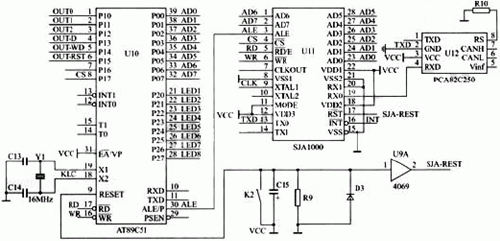 ECU(AT89C51)+CAN控制器(SJA1000)+CAN收发器(PCA82C250)的电路结构以下是其核心芯片简介: