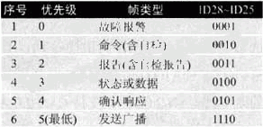 本协议采用帧优先原则分配标识符,每一帧标识符中的高四位表示帧类型,不同帧类型有不同的优先权,优先权决定了各种信息帧在同等情况下的发送顺序,协议中的29位标识符的分配如下: