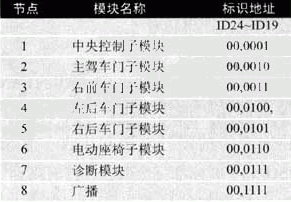 本协议遵循CAN2.0B规范,根据车身控制??榈奶氐悖捎迷?rarr;目的方法,每个节点都有自己固定的标识地址,且节点数小于64,设计时可将中央控制模块设为主节点,而将车门、电动座椅子??榧白约熳幽?樯柚梦咏诘?。本协议可完成以下功能: