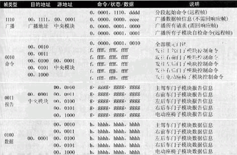 表3所列是中央控制??橛胝锒夏?榈耐ㄑ侗ㄎ亩ㄒ?。表中,aaaa为分段号,可在故障代码多于8个时设置,最多可达传送16×8个字节代码;bbbbbb为各传感器代号,其响应帧采用不分段的数据帧,cccccccc为执行相应动作的代码,如车窗上升为00000001,下降为00000010,该响应最多可以执行256个动作。响应帧采用远程帧,请求帧为远程帧。