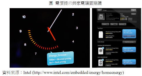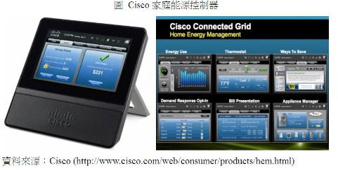 在绿色节能观念的日益普及趋势下,有效管理家中用电的家庭能源管理(Home Energy Management,HEM)成为智慧电网公共建设外,另一项具备高度发展潜力的市场领域。面对民众对节能管理的需求,现阶段陆续已有许多国际大厂投入相关应用与服务的研发;除了Google推出PowerMeter的用电监测网路平台外(需搭配智慧电表或插座等设备),Cisco与Intel也陆续搭上平板电脑热潮,推出协助民众管理家庭用电的HEM装置。相较于Google PowerMeter,Cisco与Intel所推出产品是以物联网(Internet of Things,IoT)概念为基础,透过无线网路模式连结家中各项电器设备,进行用电资讯的传递与监控,同时进行远端??囟鳌?Cisco推出包含家庭能源控制器(Home Energy Controller,HEC)与能源管理服务平台的家庭能源管理解决方案(Home Energy Management Solution,HEMS),作为进入家庭节能市场的第一步。 HEC如同家庭中的监控中心,除了可以在萤幕上即时显示家中用电的即时状态资讯外,使用者透过触控面板的HEC还可以对连线的家电产品进行操控,决定是否关闭或调整特定家电来节省电力消耗。