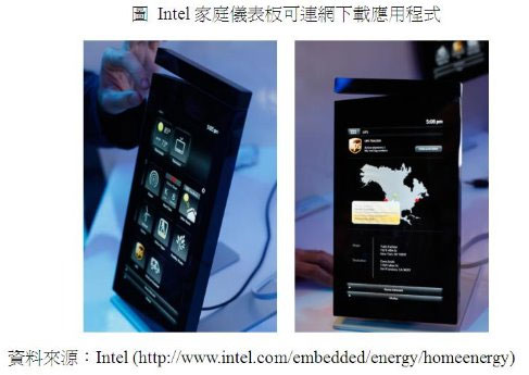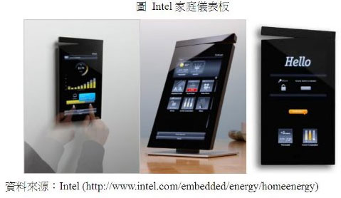在家庭能源管理的概念下,Intel也推出暂称为「家庭仪表板(Home Dashboard)」的整合性解决方案,产品设计为一个具备运算能力且低耗能的平板电脑。 Intel规划此产品成为家庭网路的核心(Heart of the Home Network),使用者可与智慧家电、智慧插座、智慧电表与家中各项感测装置进行连结与监控动作,并进行家电设备的安全设定、温控设定、电源
