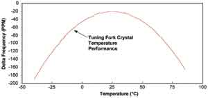 温度的不稳定和相应的温度系数是许多应用所面临的问题,特别是那些工作在宽温范围的应用,如室外电表或水表。标准的用作RTC时基的32.768kHz音叉晶体的频率响应与温度之间的关系为Δf/f=k(T-T0)2+f0。其中,Δf为频率偏差,f为基频,k为曲率,T为温度,T0为折点温度,f0为折点温度处的频偏。