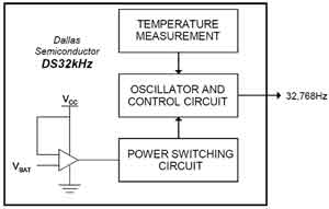 本节将以Maxim公司的DS32kHz温补晶体振荡器为例,介绍通过改变晶体负载电容修正由于温度变化产生的频偏的概念,如图2所示,Maxim的这项内部校准技术还获得了专利。DS32kHz可以作为大多数系统的32kHz输入,如RTC或内置RTC的微控制器。