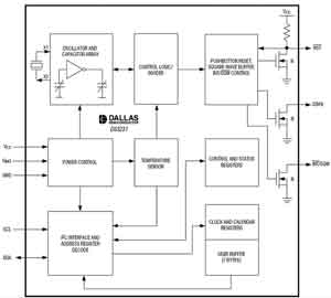 本节将以Maxim公司的DS3231为例,介绍带有温偿晶振的RTC。如图4所示,DS3231内部集成了温补振荡器,类似于DS32kHz。除了RTC和振荡器外,DS3231还包括以下电路??椤?br />