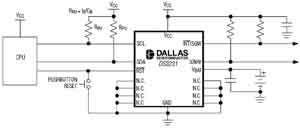 如图5所示,典型的DS3231应用电路内部集成了晶体,其他电路类似于普通RTC,设计人员无须考虑分立晶体的选择和布板。因为DS3231包含经过温度补偿校准的振荡器,可显著提高RTC的初始精度和温度稳定性。由于内嵌在封装内的晶体已经经过高温老化处理,DS3231与分立的晶体相比具有更好的长期稳定性。精度可以达到±2×10-6,温度范围0~+40℃。
