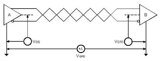 如图1所示,当发送器A向接收器B发送数据时,发送器A的输出共模电压为VOS,由于两个系统具有各自独立的接地系统存在着地电位差VGPD,那么接收器输入端的共模电压就会达到VCM=VOS+VGPD。RS-485标准规定VOS≤3V,但VGPD可能会有很大幅度(十几伏甚至数十伏),并可能伴有强干扰信号致使接收器共模输入VCM超出正常围,在信号线上产生干扰电流轻则影响正常通信,重则损坏设备。