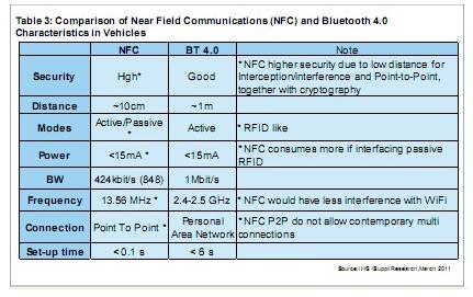 IHS公司预计,NFC技术在汽车领域将是一项补充性技术,并将与蓝牙和Wi-Fi等目前比较成熟和普及的技术共存。因此,蓝牙和NFC将互相补充。
