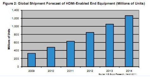 据IHS iSuppli公司的研究,液晶电视和其它高级数字设备的事实性连接标准HDMI,将被2011年出现的将近6.3亿个消费电子产品采用,充当主要的设备接口,尽管在中国面临另外一种标准的挑战。