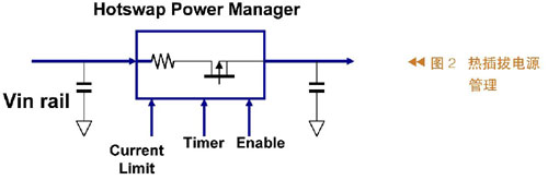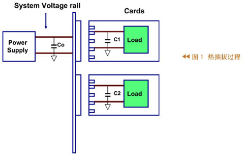 图1所示为热插拔过程,其中左边代表系统及其供电,在供电的输出端有一个电容,右侧有两张卡,这些卡的输入端也有电容。把卡插入系统之前,输入电容没有被充电;当把卡插入系统时会有一个很大的瞬间电流向输入电容充电,这么大的瞬时电流很可能造成系统供电电压不正常。