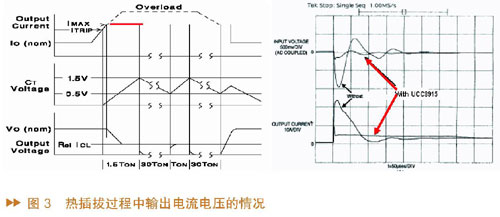 接下来以UCC3915为例说明热插拔过程中输出电流电压的情况。图3中,左边图形是UCC3915的输出电流、输出电压、即时电容电压的波形,可以看到当输出电流上升到ITRIP时,计时电容开始充电,电压上升,开始计时;如果输出电流超过ITRIP并一直上升到IMAX(设定的最大值),由于此时MOS管工作在线性模式,将最大输出电流限制在这一水平而不让输出电流上升,因此输出电流就会被限制在IMAX。