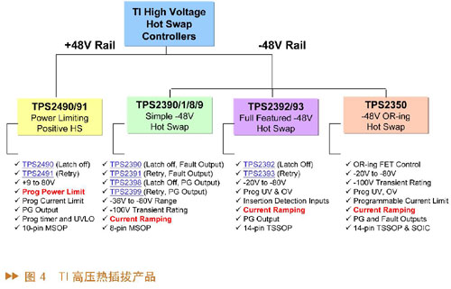 对于高压热插拔产品,又可以分为两类:+48V产品和?48V产品,如图4所示。48V的产品有TPS2490和2491,这个产品的工作电压从9V到80V,含有一个独特的功能叫做定功率的设定。?48V的热插拔控制芯片,包括TPS2390、2391、2398和99,这个系列针对简单的热插拔的应用,工作电压从?36到?80V,是8只脚的封装。第二个48V的热插拔是TPS2392和TPS2393,是属于全功能?48V的热插拔产品,除了拥有TPS2390系列的所有功能之外,也含有欠压和过压的设定,提供两只脚做连接器的检测。