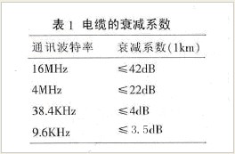 导线的电阻对信号的影响很小,可以忽略不计。电缆的分布电容C主要是由双绞线的两条平行导线产生。信号的损失主要是由于电缆的分布电容和分布电感组成的LC低通滤波器。通讯波特率越高,信号衰减也会越大。常规电缆的衰减系数见表1.