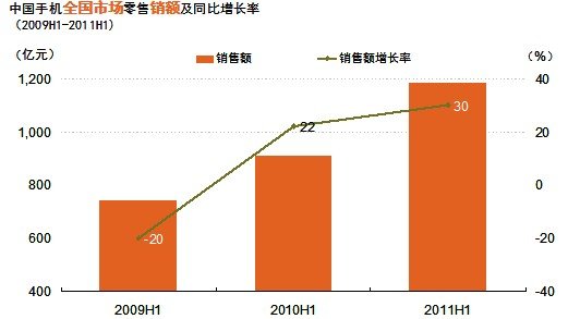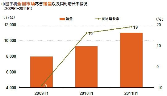 2011年上半年手机市场继续保持较快增长。据GfK(捷孚凯中国)全国零售监测数据显示,2011年上半年销售量已达到1.1亿台,同比增长19%,销售额达到1186亿元,销售额同比增长30%。
