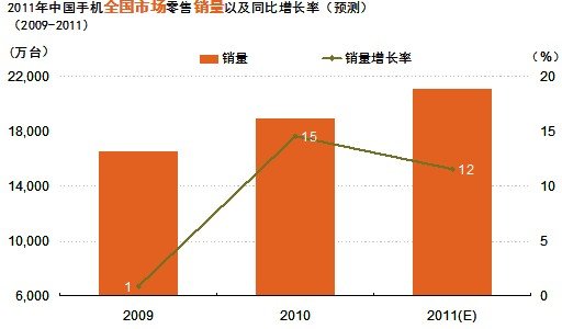 2011年上半年中国的手机市场在3G加速发展,智能手机大力推广以及运营商的推动共同作用下延续了2010年的增长势头,但是2011年下半年的手机市场规模与上半年相比将略有下降,销量将达到1.02亿台,销售额将达到1166亿元。据GfK预测,2011年全年手机销售额将达到2352亿元,手机销量将达到2.1亿台,同比上升12%。