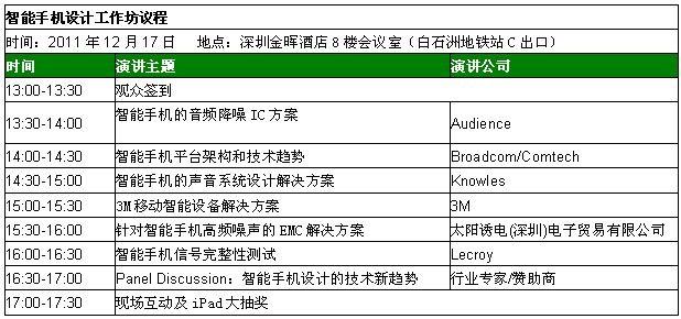 HTC、SAMSUNG、LG、SHARP、AT&T、SK Telecom、PANTECH、DoCoMo 等手机设计领军厂商在智能市场领域的竞争非常激烈,他们都用到哪些技术?由我爱方案网(www.52solution.com)、电子元件技术网(www.5r3h.cn)和China Outlook Consulting主办的首届智能手机设计工作坊(Smart Phone Design Workshop)将于2011年12月17日下午在深圳金晖酒店8楼会议室隆重召开!为您Hold 住 2012 智能趋势,给力手机开发设计!