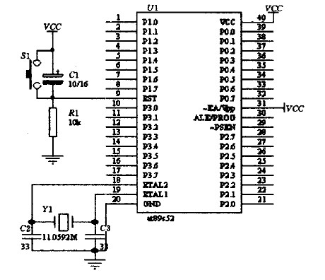 本单片机通过RS232串行通信接口与GSM ??橥ㄐ?,提取GSM 设备的短信,发送相关的信息,并通过串行通信接口与红外模块相连,利用红外???,达到主、分机之间的通信,因此,选用AT89S52芯片??刂粕闲枰玫搅礁龃薪涌冢?9S52只有一个串口,故还需要在程序中进行模拟串行接口通信。其最简外部接线电路如图2所示。