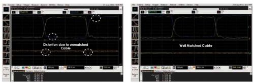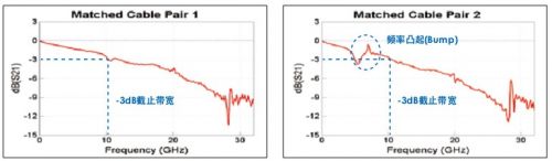 图1,匹配电缆对的频率响应,额定带宽为18GHz。-3dB截止带宽实际上大约为10GHz,低于额定带宽。除此之外,两条电缆的特性不相似,可能在部分信号内容过度衰减或放大时导致波形失真。特别是在第二条匹配电缆对上,可以在5GHz~8GHz之间看到频率响应凸起
